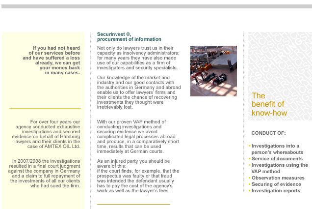 procurement of information, services, suffered a loss already, get your money back, investigations, secured evidence, lawyers, clients, case, amtex oil ltd., final court judgment, claim, full repayment, investments, sued, firm, trust, insolvency administrators, investigators, security specialists, knowledge, market, industry, contacts, authorities, chance, recovering investments, irretrievably, lost, proven, method of conducting, produce, short time, results, at german courts, injured party, prospectus, faulty, fraud, intended, defendant, pay, cost, agency’s work, lawyer’s fees, benefit, know-how, conduct, investigations into a person’s, whereabouts, service of documents, investigations, observation measures, securing of evidence, investigation reports