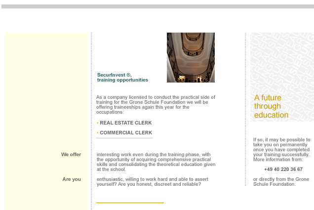 training opportunities, practical side of training, grone schule foundation, offering traineeships, occupations, real estate clerk, commercial clerk, practical skills, consolidating the theoretical education, honest, discreet, reliable, on permanently, training, successfully, future, education
