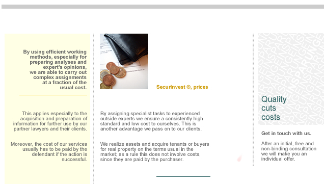 prices, inexpensive, free, analyses, expert’s opinions, complex assignments, fraction of the usual cost, acquisition, preparation, lawyers, clients, cost of our services, paid, defendant, advantage, successful, action, specialist tasks, experienced outside experts, high standard, low cost, realize assets, acquire, tenants, buyers, real property, purchaser, non-binding, consultation, individual, offer, quality, costs